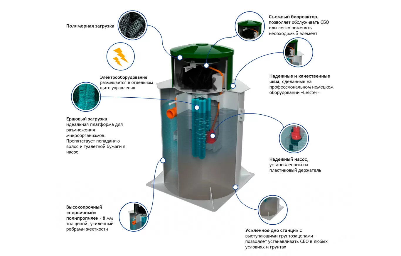 системы водоотведения. Септики качественно и быстро очищают сточные воды в заявленном объеме и способны работать даже при перебоях с